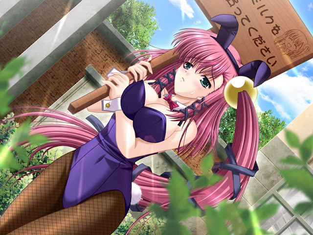 Phew, that pretty much covers it all. Just mind it that answers to the mysteries aren't really cool, so upon learning all of them game loses much of its charm. I really liked the common routes because of of pervert cousin Misao and constantly embarrassed Nao. The gags they produce are hilarious. At one moment I even thought that Nao is voiced by Naruse Mia - the voice got same funny. But I was always waiting for virtual world logins as Melaria really managed to grab the attention even while being a naive heroine. Melaria does not exist in the real world (well, except for her route), so she is not stupid naive, just naive about RPG. And that everlasting gag about Melaria hitting samurai bunny with the book and asking to forgive her all the time is just hilarious. I'd also want to notice that game cleverly uses repeats. Like Nao always says "Hai" wa ikkai where Hai can be Hoi, Ai, Ey etc. And then when Nao disappears and someone else says the same it strikes really hard. I'm saying all that in an attempt to explain why common route and Melaria route thrilled me so much. Just add here guildmates, permadeath, grind, time loop, player killer, beasts as if from abbyss, and I get enthralled.